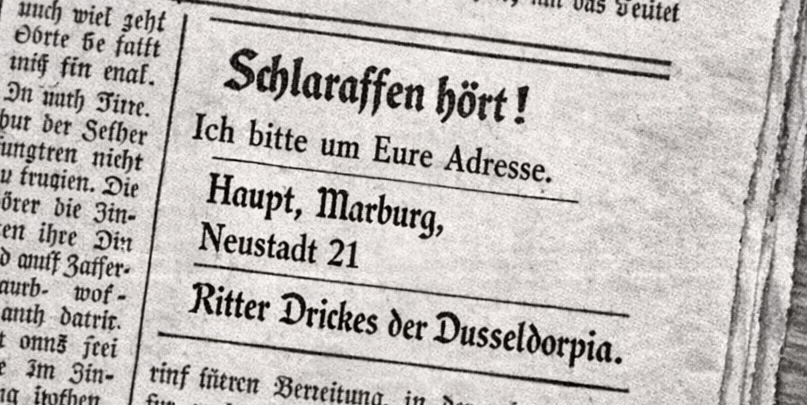 Am 23. Heumond, Anno Uhui 87 (23. Juli 1946) schaltete der nach Marburg verschlagene Ritter Drickes aus dem Schlaraffenreich Dusseldorpia eine kleine Anzeige in der Marburger Presse. Sie lautete: