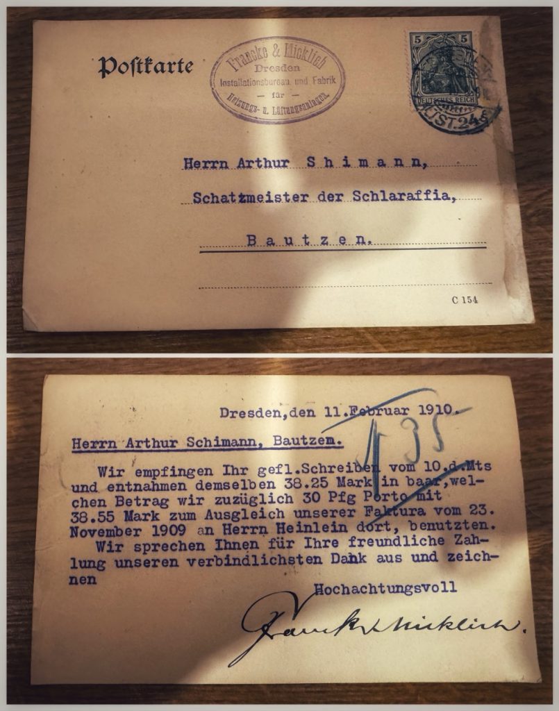 Besonders zu künden ist von einem gar köstlichen Fundstück, hervorgebracht von Ritter Modera-Tor, genannt der schüchterne Redefix. Er zeigte eine Postkarte aus dem Jahre des Herrn 1910, gerichtet an den Schatzmeister der Schlaraffia Bautzen. Ein stiller Gruß aus vergangenen Tagen, der uns mahnte, dass auch große Reyche einst kleine Setzlinge waren.